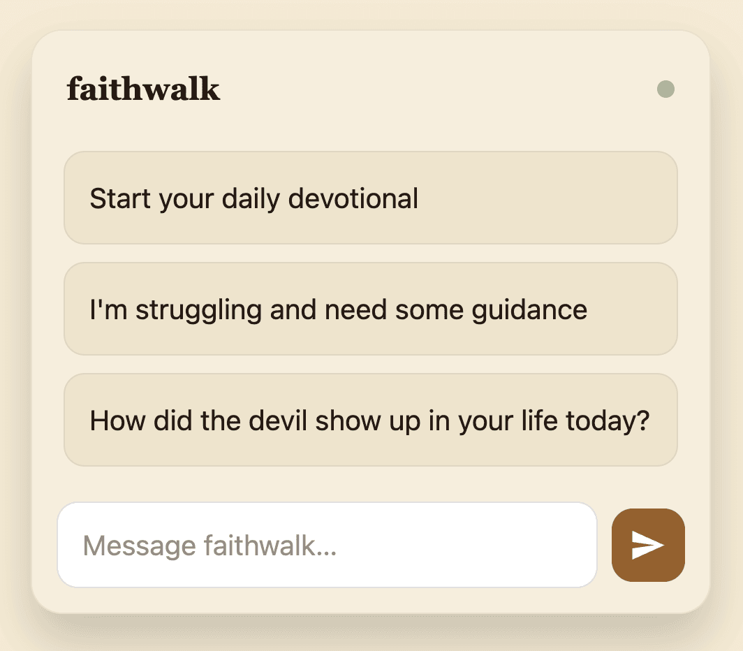 Give your people more than a Sunday sermon. With FaithWalk, you can extend your teaching into their daily lives—delivering devotionals, encouragement, and spiritual guidance in the very language and tone they already know and trust: yours.